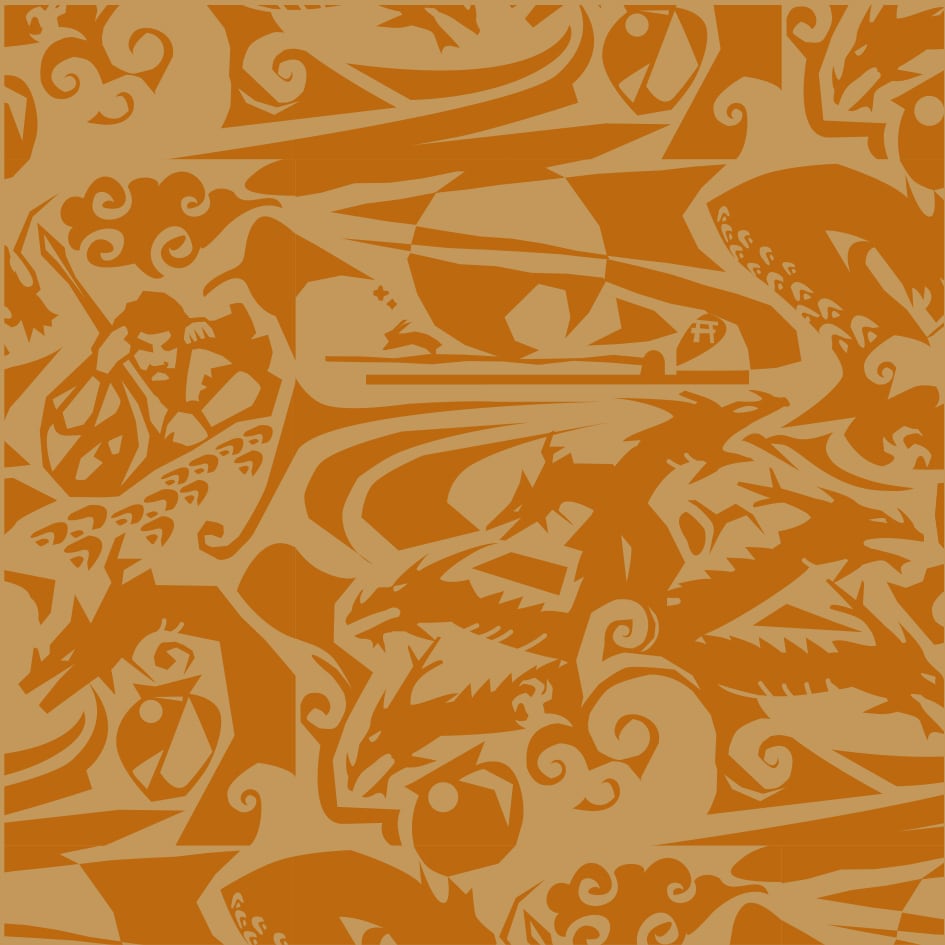 出雲神話に伝わるスサノオとヤマタノオロチ物語をモチーフに、ダイナミックな図柄と色合いで、大蛇と神の対峙を描いています。