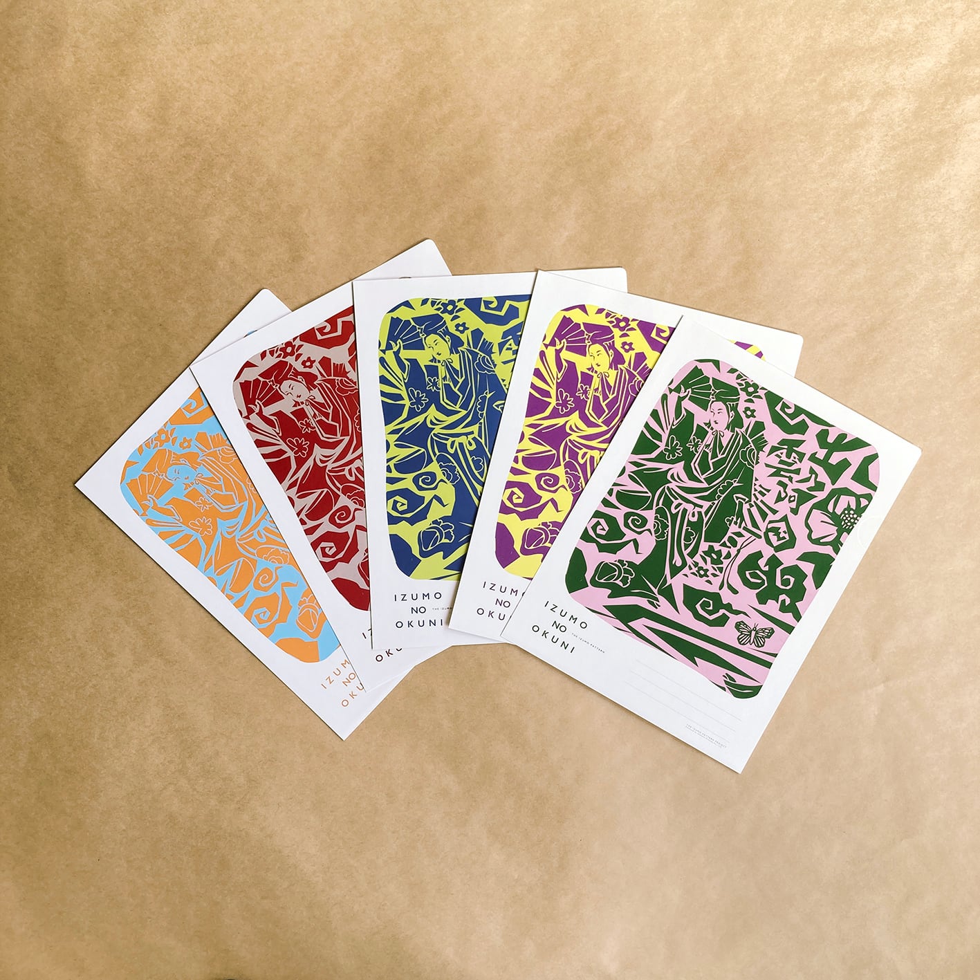 THE IZUMO PATTERN PROJECTに「イズモノオクニ」柄が登場。出雲大社の巫女とされ、歌舞伎の起源とされる「かぶき踊り」を始めたと言われる伝説的な女性芸能者「出雲阿国」をイメージしたデザインです。カラフルな色合いの5色展開。